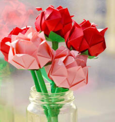 Give an everlasting gift of love! Folded paper roses in either sets of five or individual, tied together with a cute red and pink ribbon and coated in acrylic to make them last.